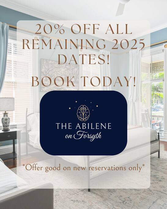 SVR # 03025 The Abilene on Forsyth - Southern Charm Redefined Located in the heart of historic Savannah, Georgia, this beautifully designed, renovated vacation home, built in 1891, blends timeless beauty with everyday ease. It is quintessentially, southern charm redefined. ⭐⭐⭐⭐⭐"I don't usually take the time to write an actual review of my stays but this place was amazing. The house was so clean and charming. Location was perfect for anyone but especially with kids being so close to the park. Host was super responsive. We will be staying again! ~Aleesha, March 2025 “Stayed with 5 other 40ish women for girls weekend. Everything about this rental was perfect… All my friends agreed we would stay here again and this was one of our best rental experiences.” – Jennie, Jan 2025 “We five old friends gathered from various places in the country and the house was perfect. There was lots of room… and the kitchen was roomy and enabled us to cook meals and have lots of options for snacks.” – Claire, Jun 2025 “The Abilene on Forsyth was spectacular. There were four of us ladies and we were all extremely happy with the accommodations… We enjoyed sitting on the rocking chairs on the front porch and watching the activities at Forsyth Park.” – Denise, Apr 2025 “All 4 of us sisters agreed that the detailing that went into upgrading this house is topnotch! My sisters and I had a wonderful trip… The highlights were our walks around Forsyth Park, eating at Collins Quarter, exploring via the trolley and eating at oh so many good restaurants!” – Heidi, Jan 2025 🛋️ Relaxing Living Spaces Unwind in the cozy living room with a plush sofa, loveseat, and 50” Roku Smart TV (streaming only). Gather for a movie night, board game session, or browse our Savannah guidebooks to plan your next adventure. 🍳 Fully Equipped Kitchen & Dining The kitchen features everything you need: full appliances, Keurig Duo (pods & carafe), basic spices, and kid-friendly dinnerware. Enjoy shared meals in the sunny dining area for 6, or grab coffee and tea at the breakfast counter (complimentary pods, creamers, and teas included). 🛏️ Spacious Bedrooms & Bathrooms Enjoy 3 private bedrooms with ensuite or nearby full bathrooms, plush beds, Roku TVs, and premium linens. Main Floor Bedroom: King bed + twin daybed; full bath just down the hall with walk-in shower. 2nd Floor Primary Suite: King bed, ensuite bath with dual sinks & tub/shower combo. 3rd Bedroom: Queen bed + twin daybed, private balcony with Forsyth Park views, ensuite bath with shower. All bathrooms include 100% natural, organic bath products and hotel-quality towels. 🌿 Outdoor Charm with Porch Views Start your mornings with coffee on the front porch overlooking Forsyth Park. Rocking chairs, shade from live oaks, and soft breezes create a quintessential Savannah experience guests rave about. ✅ Guest Amenities ✔️ 2 off-street parking spaces ✔️ Free high-speed Wi-Fi (up to 500 Mbps) ✔️ Full laundry room (washer/dryer, iron) ✔️ Family-friendly (high chair, Pack & Play, games) ✔️ Eco-conscious cleaning with non-toxic products 📍 Walk to Savannah’s Best Attractions Located in the Southern Historic District, steps from: Forsyth Park Fountain (5 min) Mercer-Williams House (12 min) Cathedral of St. John the Baptist (15 min) Broughton Street shops & Leopold’s Ice Cream (25 min) River Street & Bay Street (30 min) Or hop on the free Dot Trolley just 2 blocks away for easy access to even more! 🎟️ Bonus Perks All guests enjoy access to local discounts at nearby attractions and experiences. Details and coupons are provided in the home. ❇️Guest access❇️ * You'll have exclusive access to the entire property, including all appliances and amenities - keyless entry codes will be provided on the day the reservation begins. *Stairs are required for entry at both the front and back. One bedroom is on the 1st floor with a full bath nearby, while two more are on the 2nd floor, accessed by steep stairs due to 11-foot ceilings. ❇️Additional rules ❇️ Make your stay a stress-free experience by following our house rules: ✓ Check-in time is at 4PM-10PM and check-out time is before 10AM to allow us to prepare for the next guests. ✓ Parties or events are not permitted on the property, and noise levels must be kept down after 10PM until 8AM to maintain a peaceful environment. Penalties may apply in the case of any damage or mess caused during your stay. ✓ To maintain a harmonious environment for all our guests, we have a strict ‘no pets’ policy. ✓ To ensure a healthy and pleasant stay for everyone, we maintain a strict no-smoking policy. This policy encompasses traditional smoking, vaping, and the use of electronic cigarettes. Please refer to the 'Additional Rules' section for all house rules. This will help avoid any possible misunderstandings. ❇️PLEASE NOTE❇️: we are located on a main street in a busy urban city. Because of our prime location, you WILL hear street noise from pedestrians and vehicles. Also, being across from the tennis courts, you will also hear noise from the matches taking place as well as practice sessions. But, they are fun to watch!! Savannah’s sub-tropical climate means hot, humid summers and occasional bugs. While The Abilene is regularly treated by pest control, we can’t eliminate all these elements. Please consider these factors, as we do not offer refunds based on these conditions.